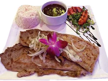 Marinated thinly sliced pork sirloin setak, sautéed on the flat griddle and topped with caramelized onions.